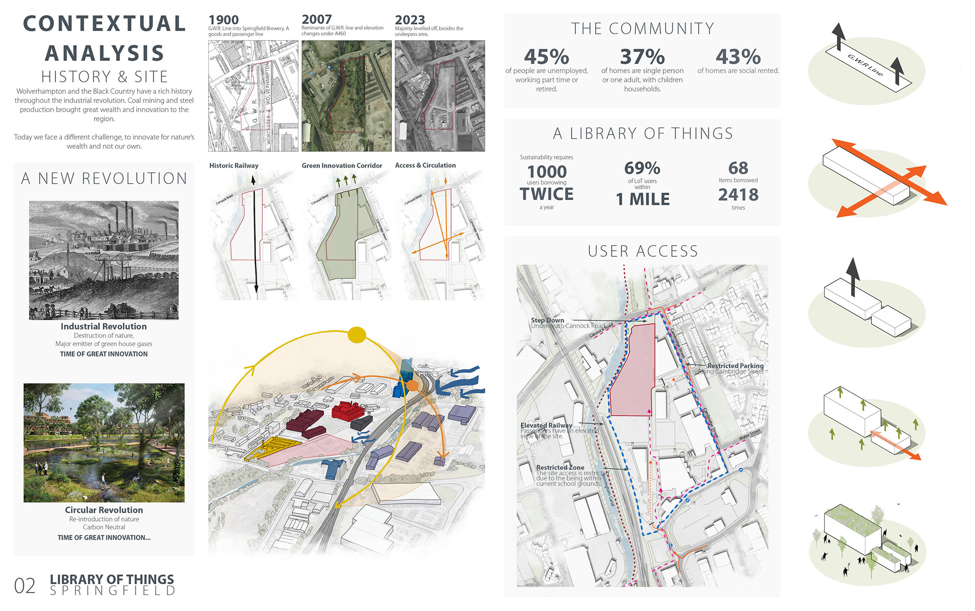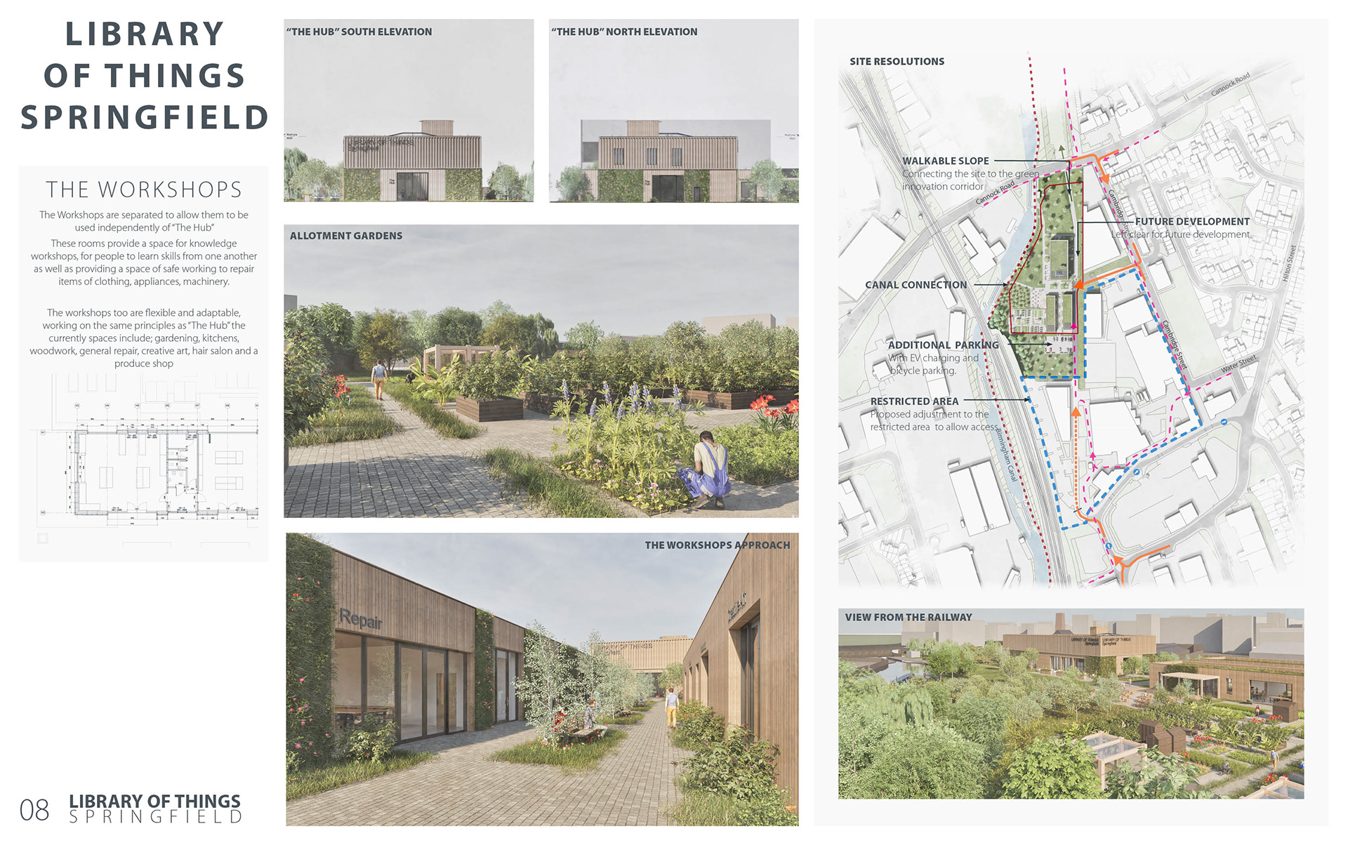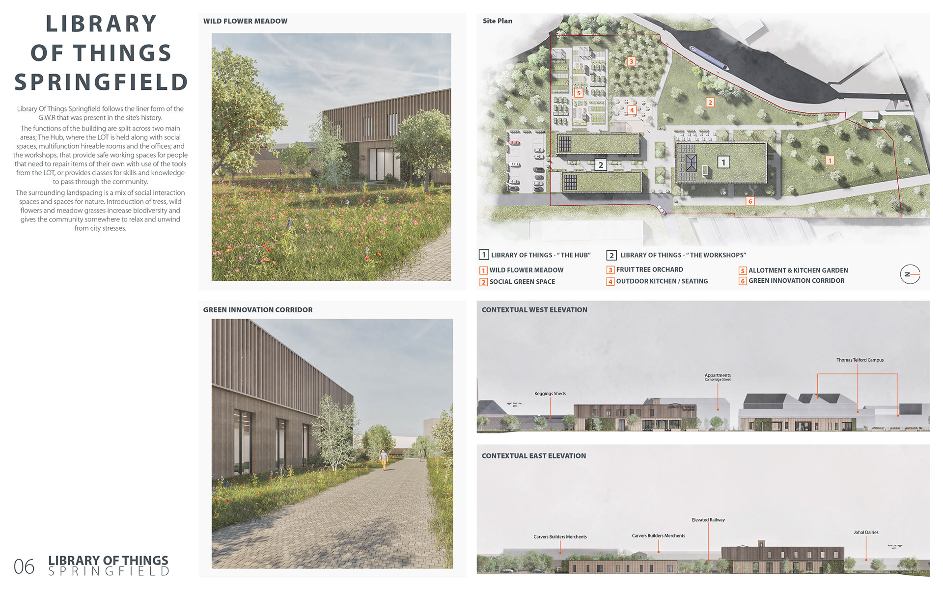 Designed as a flexible, modular system, the building can adapt to evolving needs while minimizing environmental impact. Located in Wolverhampton’s Springfield district, the project integrates green infrastructure, repurposed materials, and energy-efficient strategies to create a hub for shared resources, education, and local enterprise. Inspired by biophilic design and industrial heritage, the scheme fosters community engagement through workshops, repair spaces, and social areas—demonstrating how architecture can drive sustainability and circularity in urban environments.
